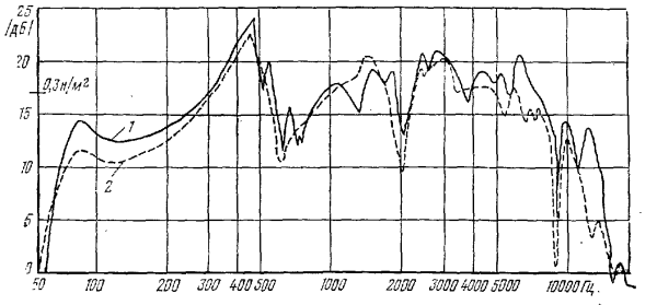 | РИС.27. Частотные характеристики головки при ее центральном расположении в прямоугольном экране (1) и при смещении вдоль длинной стороны (2). |