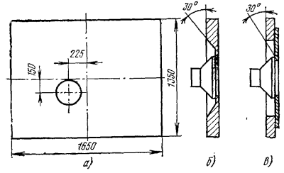 | РИС.28. Стандартный акустический экран для измерения головок прямого излучения (а) и способы крепления головок в экране (б, в). |