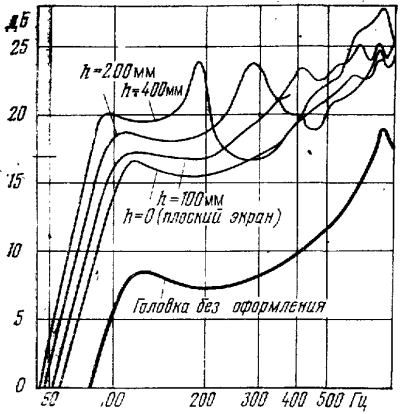 | РИС.33. Частотная характеристика головки в открытом оформлении с разной глубиной h. |