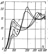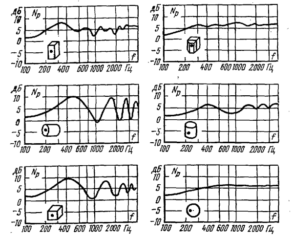 Конфигурация оформления оказывает большое влияние на форму частотной характеристики на средних частотах, вызывая появление многочисленных пиков и провалов прн неудачной конфигурации. Это хорошо видно из рассмотрения графиков на рис. 36, где приведены частотные характеристики для разных конфигураций оформления: сферического (шара), куба, усеченной пирамиды, параллелепипеда. Наиболее благоприятная форма — сфера. Приведенные характеристики следует иметь в виду при выборе конфигурации оформления, хотя из конструктивных соображений редко можно применить благоприятную форму из числа приведенных на рис. 36, за исключением параллелепипеда. Из эстетических соображений размеры оформления в виде параллелепипеда часто выбирают так, чтобы размеры лицевой панели (длина и ширина) и глубины относились как 2/sqrt(2/1).