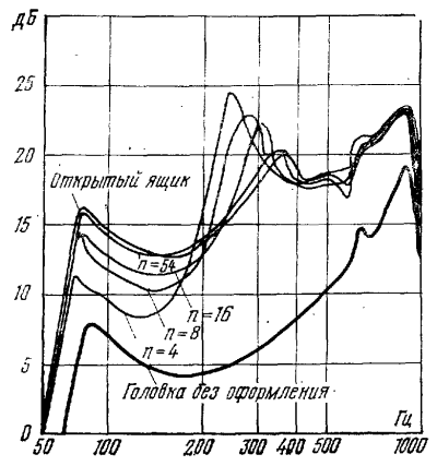 | РИС. 35. Частотные характеристики головки в открытом оформлении с различным числом отверстий (n) диаметром 20 мм в задней стенке. |