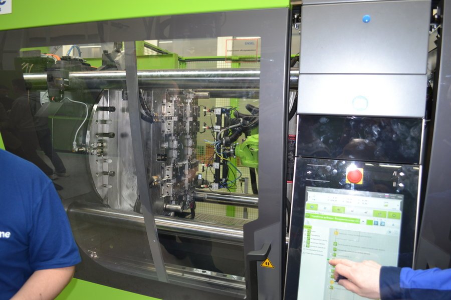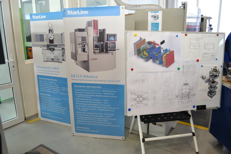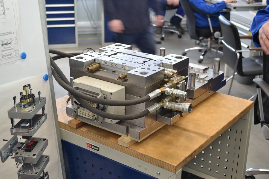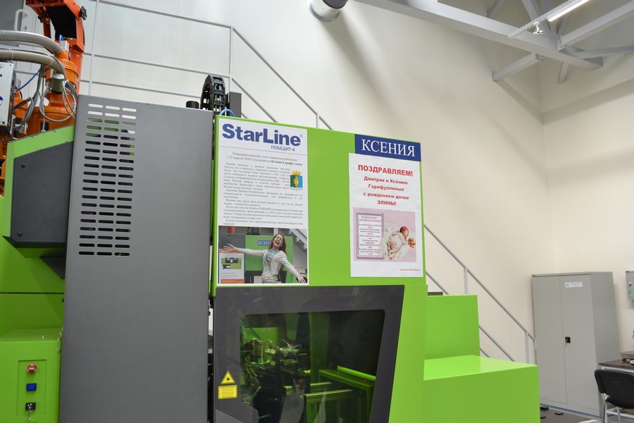 Нам показали линию Старлайн по производству пластика для корпусов основных блоков и брелоков. Производитель своими силами производит пресс-формы, в которых потом льёт требуемые пластиковые детали. У каждого агрегата на производстве есть свой покровитель!