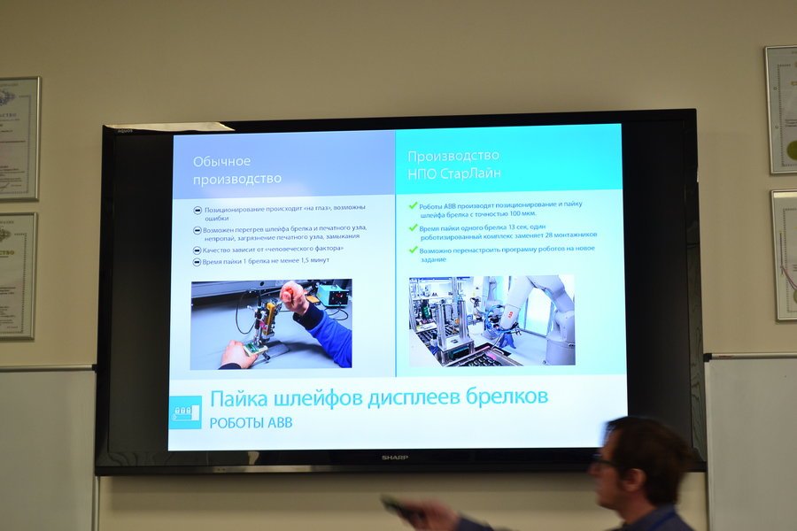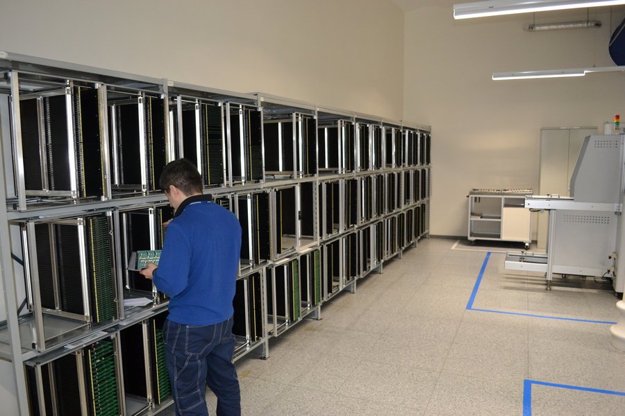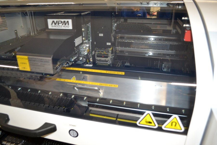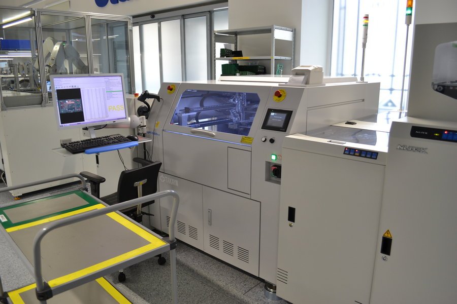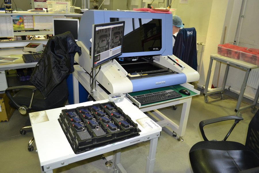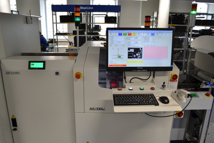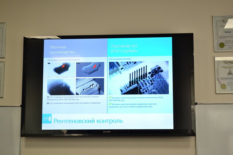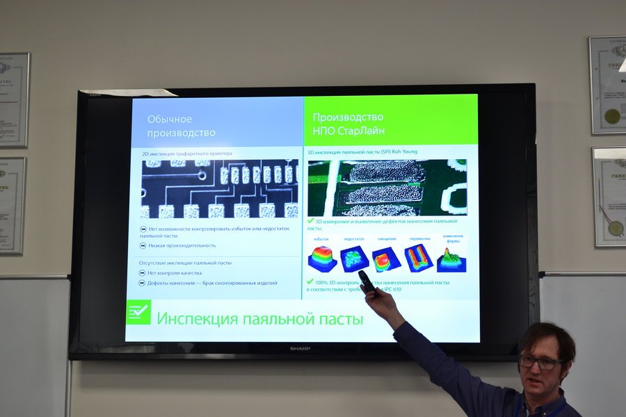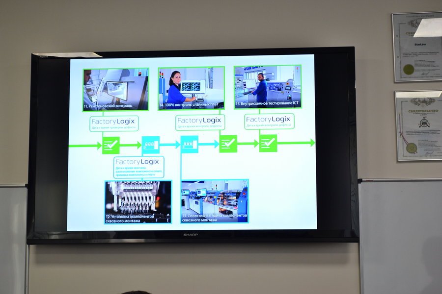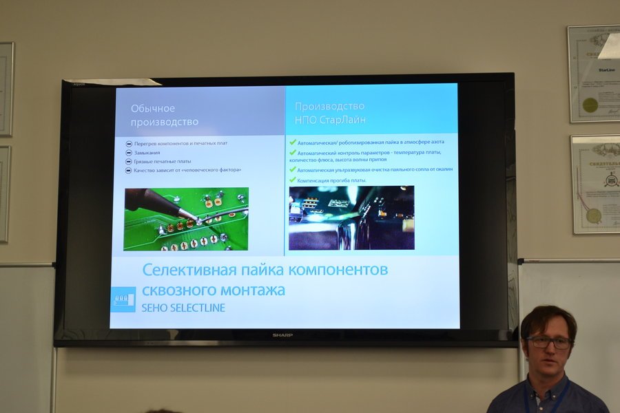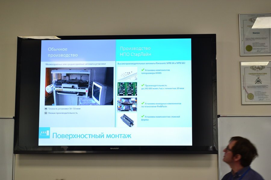 После обеда мы посетили линию монтажа Старлайн. В идеально чистом помещении происходит загрузка печатных плат на конвеер, нанесение маркировки, паяльной пасты, деталей и прогрев до нужной температуры для расплавления пасты в специальной печи. Линия полностью автоматизирована, люди 2-3 оператора только контролируют процесс. После каждой операции происходит контроль качества. Везде царит идеальная чистота, как в операционной. На работу роботов, которые устанавливают детали на плату можно стоять и смотреть вечно. Аналогично можно зависнуть у робота-тестера, который проверяет платы после монтажа.