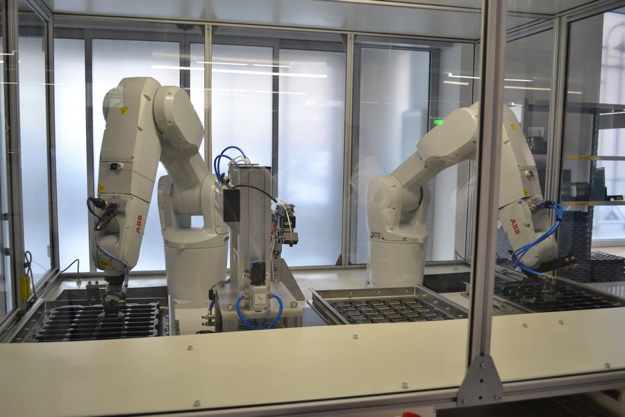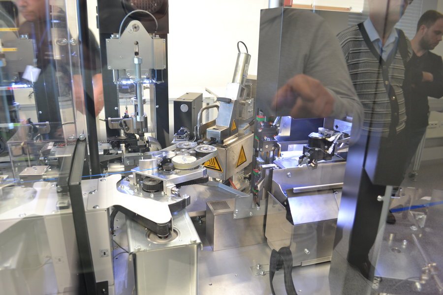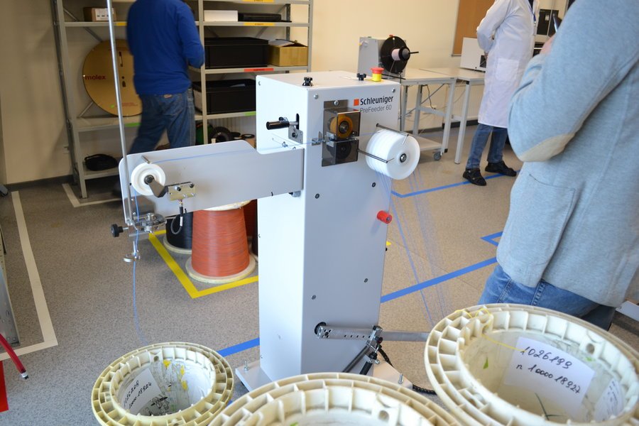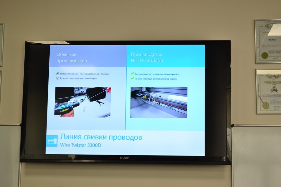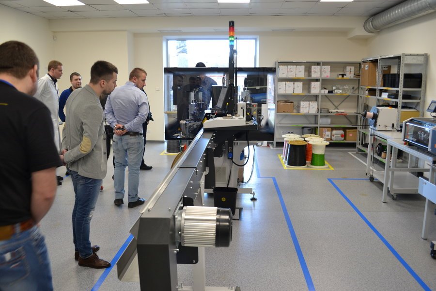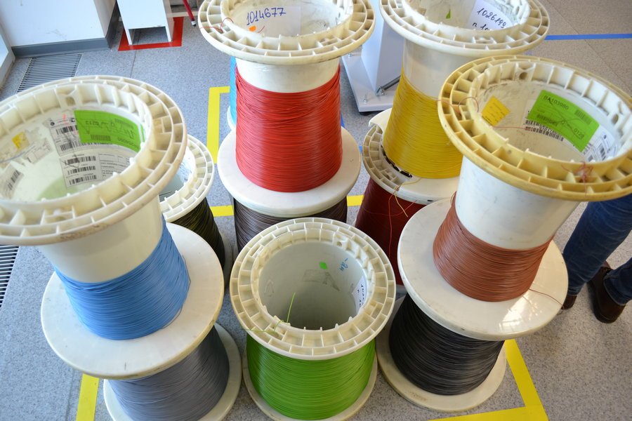 Далее нас пригласили в цех, где происходит нарезка и облуживание проводов, а также стоит робот, который делает витые пары.