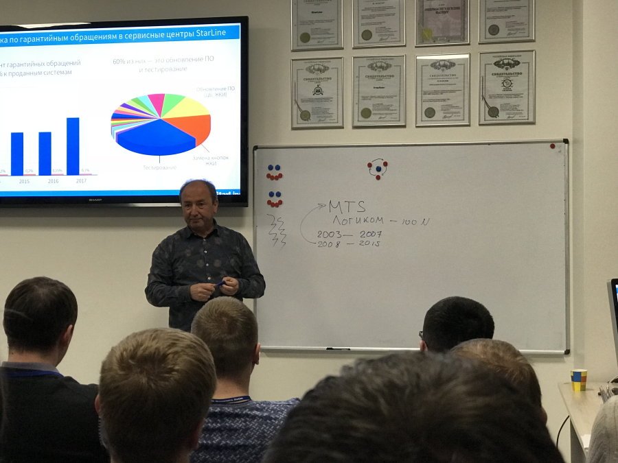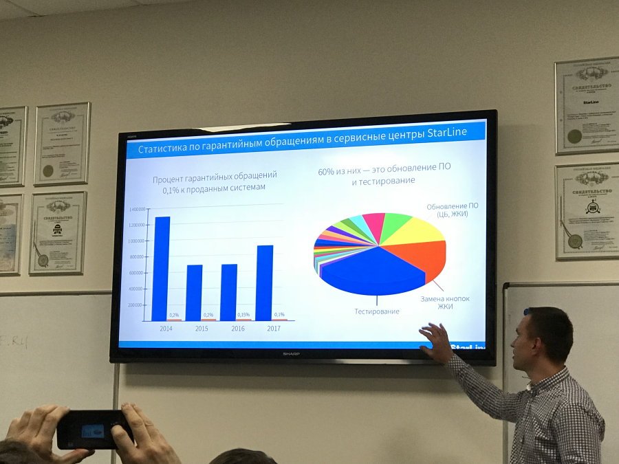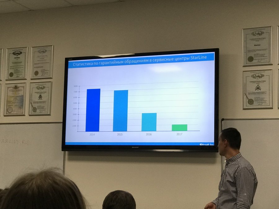 Рассказали о круглосуточной технической поддержке, которая работает максимально эффективно и позволяет снять часть работы, по консультаци конечных клиентов, с установщиков за счет инженеров Старлайн. Каждый оператор обслуживает порядка 100 звонков за смену и каждый старается максимально эффективно решить проблему владельца продукции. Участники конференции отметили что в последнее время поддержка стала работать значительно эффективнее, а также сильно уменьшилось время ожидания ответа оператора.