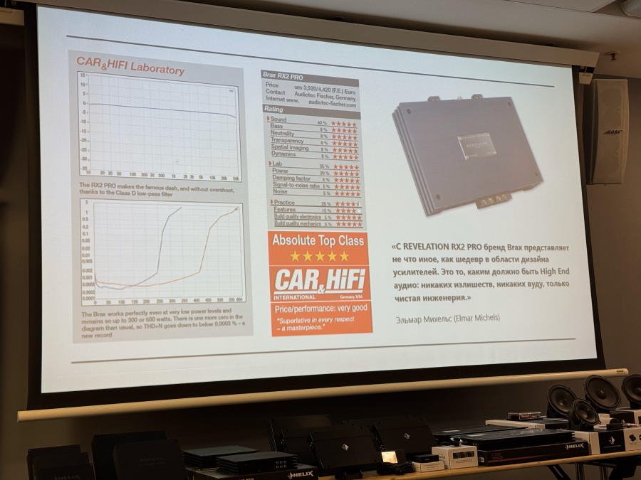 Дмитрий рассказал нам о лучшем на сегодня усилителе мощности в мире Brax Revelation RX2 Pro, который появится в продаже в России примерно через две недели. Официально класс D победил AB, и этот факт признан ведущими мировыми экспертами из журнала Car&HiFi. «Олды», ищущие топовые усилители класса A или AB, могут расслабиться.
