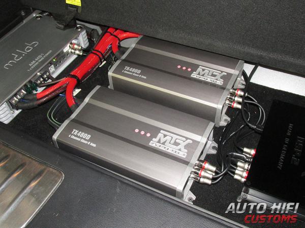 С другого торца усилителя MTX TX480D размещены разъемы подключения по входу высокого уровня, RCA разъемы для подключения по сигналу с выходов предусилителя, а также фишка для подключения внешнего вентилятора, питание на которую подается при нагреве усилителя до 80 градусов по Цельсию. Регулировки кроссовера позволяют обрезать частоты отдельно для каждой пары каналов, сверху или снизу с плавным выбором частоты от 40 до 400 Гц. с крутизной спада 12 дБ.