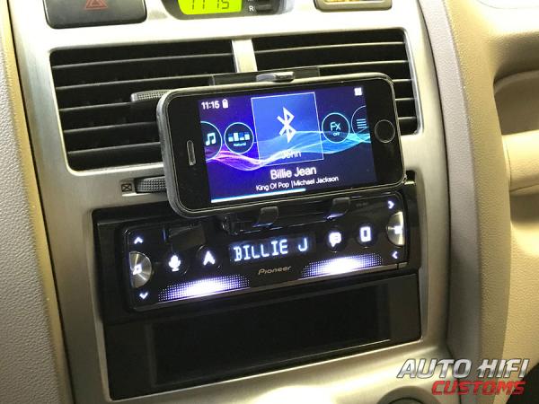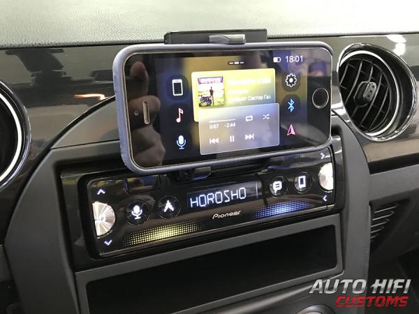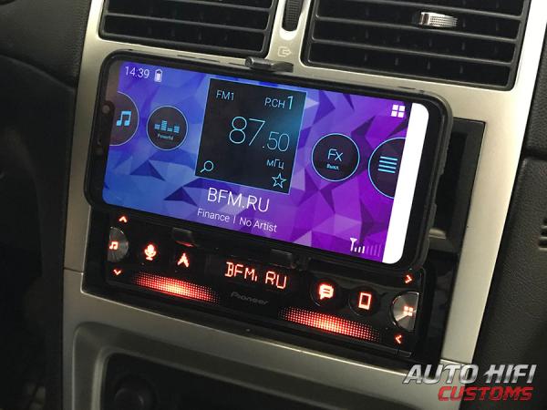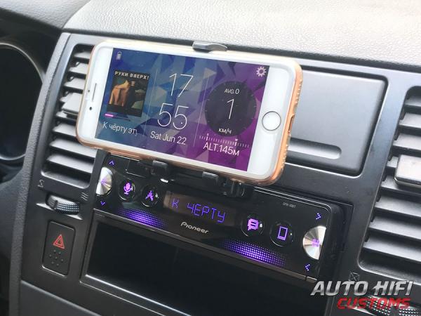 По центру в верхней части передней панели магнитолы Pioneer SPH-10BT есть выдвижной держатель для смартфона. Чтобы его выдвинуть, необходимо снять переднюю панель и потянуть на себя. Когда он выдвинется вперед до упора, нужно поднять его вверх и будут доступны «лапки» для установки смартфона. Судя по диапазону их захвата, в них можно установить любой смартфон, но даже самый маленький планшет вряд ли влезет. Захваты прорезинены, держат, установленное в них устройство отлично, при этом имеют возможность поворота на 90 градусов для приведения смартфона в горизонтальное или вертикальное положение.