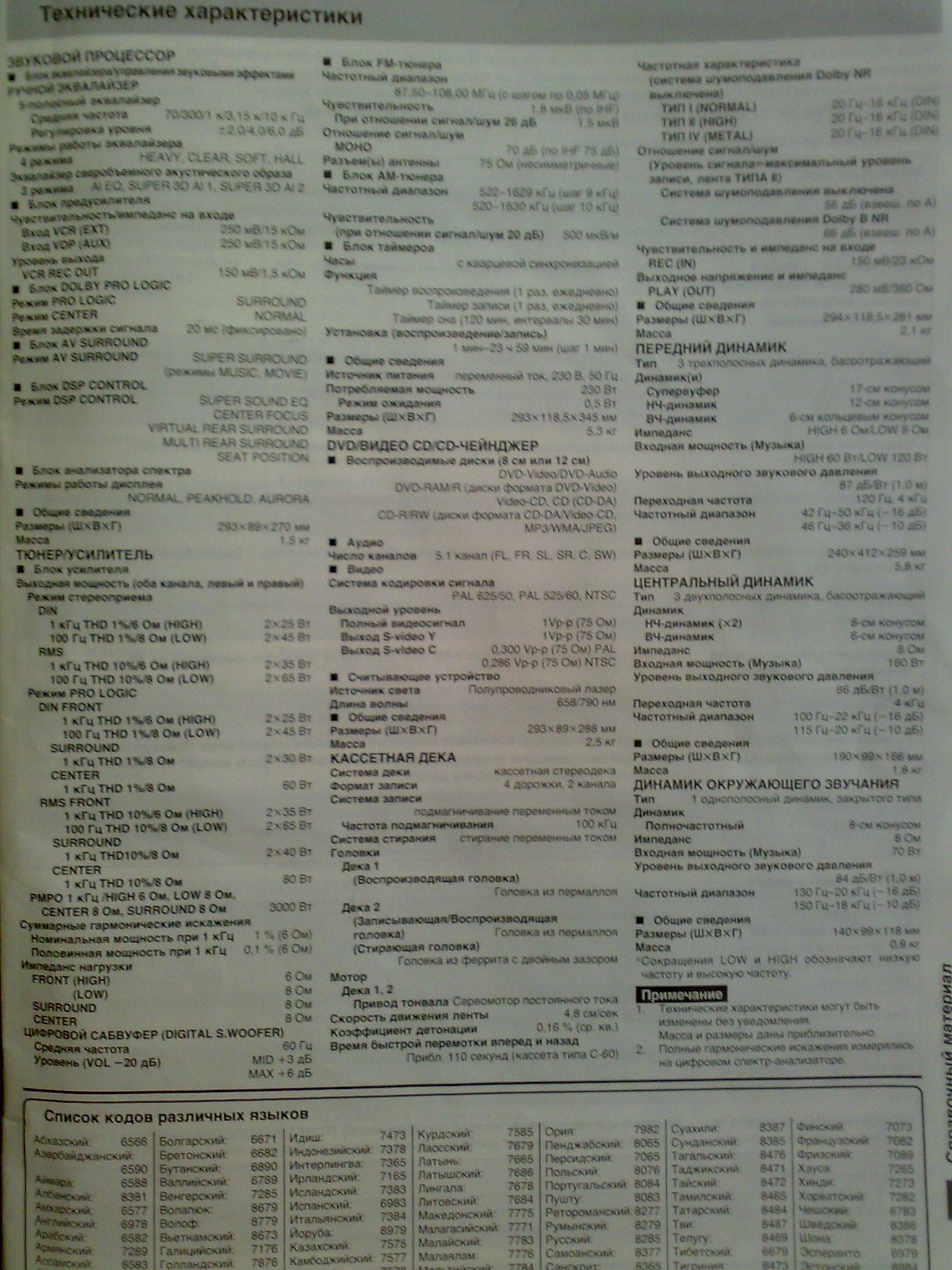 Доброго времени суток, у меня вопрос не по автозвуку, а по домашнему. Дома стоит дека Technics dv-290, не подскажите какой сабвуфер можно к нему подключить, ниже выкладываю характеристики из книжки по эксплуатации. Спасибо.