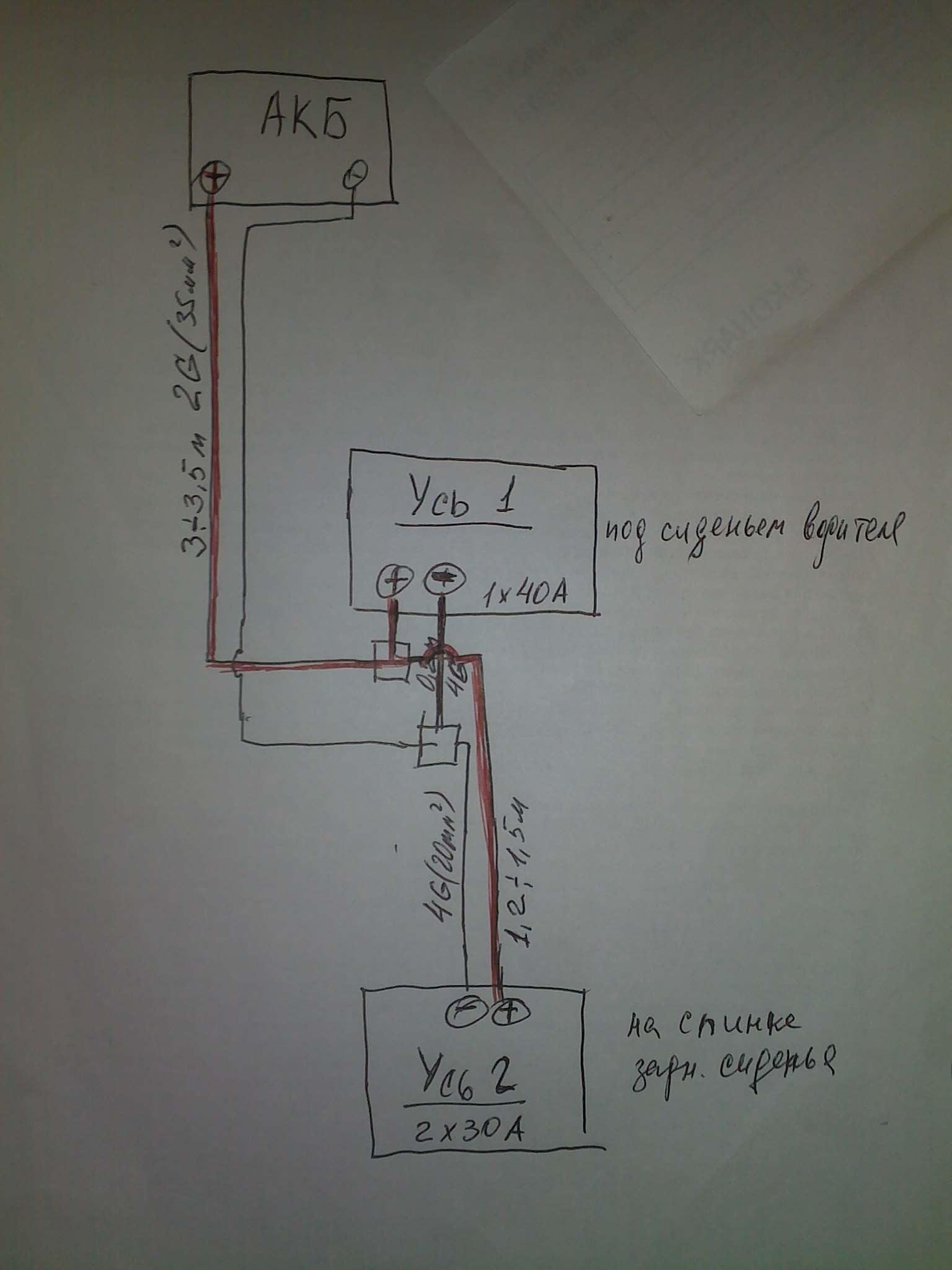 Всем привет и с 1-ым днем Весны!А значит скоро тепло- и возле машины тоже! Поскажите по проводке:правильно все?Пред-ль возле акум-ра-(сейчас 60 а)-какой Ам надо? На распредах(они от 1-ого уся в 20см) предохранители надо??обязательно?По кабелю-сечение -так все нормально будет?Или что-то изменить?