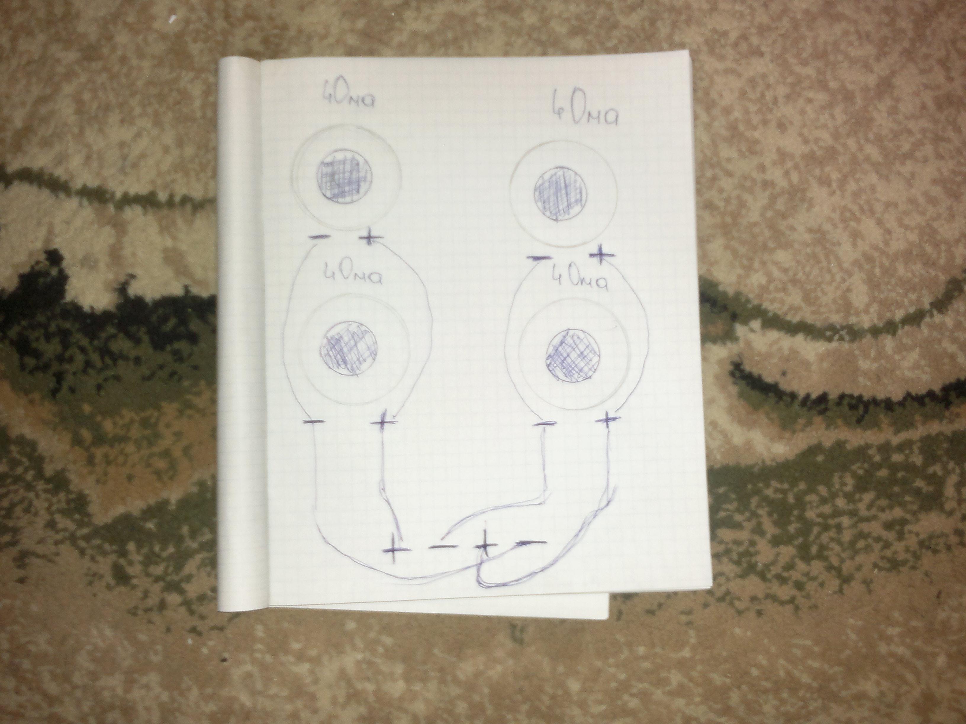 я не очень понял что ты там нарисовал......на 2х кан есть ++ и -- берёшь + одного канала и кидаешь на - другого это мост соед.....а на саб подключаешь всё как есть + к + катушки и так же с минусом