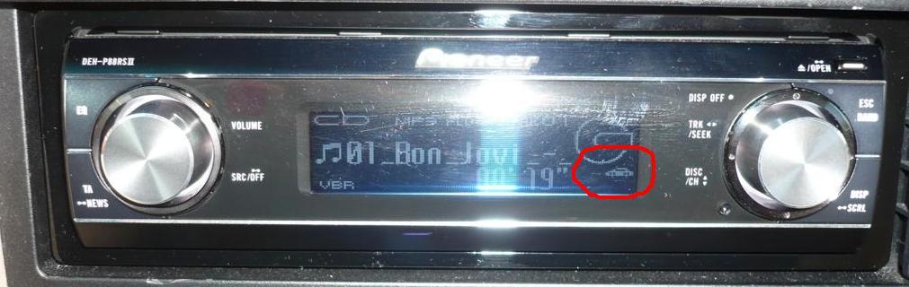 Это индикатор ТР - программы дорожных сводок, появляется когда радиоприемник настроен на ТР-станцию, почему отображается и при воспроизведении диска не знаю, попробуйте попереключать радиостанции пока не исчезнет или отключить функцию приема дорожных сводок.