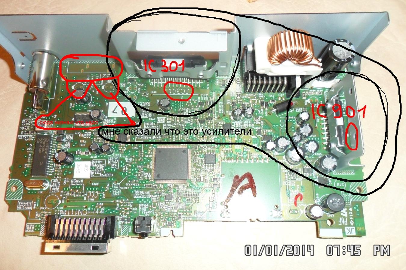 в последней фотке правильно только что 301 я микросхема на радиаторе и есть усилитель мощьности,а справа стабилизаторы,тебе надо найти четыре одинаковых конденсатора около 0.1 мкф,через которые идёт сигнал на 301 микруху,и подпаятся к ним не со стороны ножек микрухи ,а с другой стороны кондёра,и желательно тоже через кондёры но электролиты неполярные,4.7 мкф,прочитай та корпусе микрухи маркировку и найди даташит в инете,так проще будет