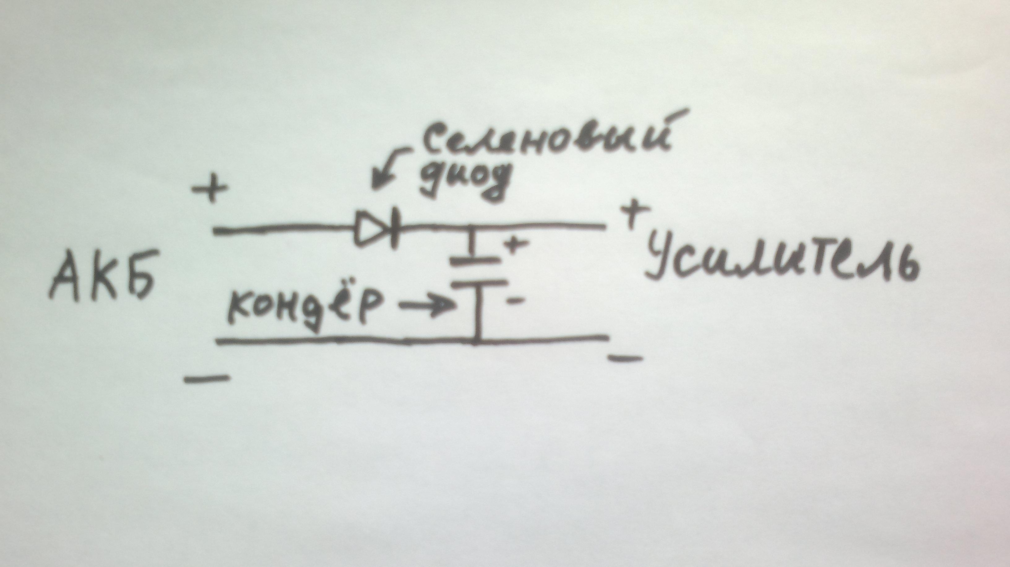 Конденсатор устанавливается в разрыв плюсового силового кабеля между аккумулятором и усилителем, расстояние от усилителя не должно превышать полметра.