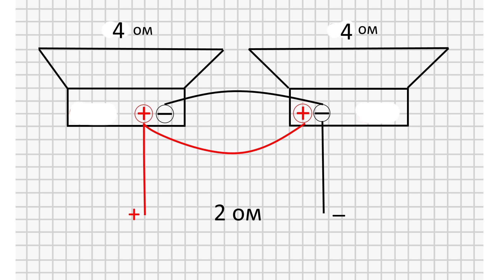 Чтобы это дело подключить на 2 Ом нужно соединить плюсы вместе и аналогично минусы. Получим один общий плюс и общий минус их к усилителю и цепляем!