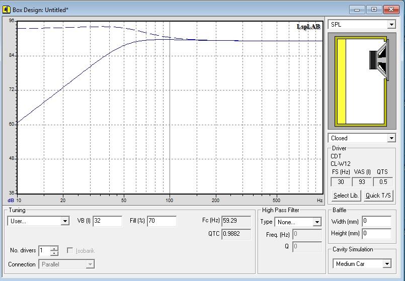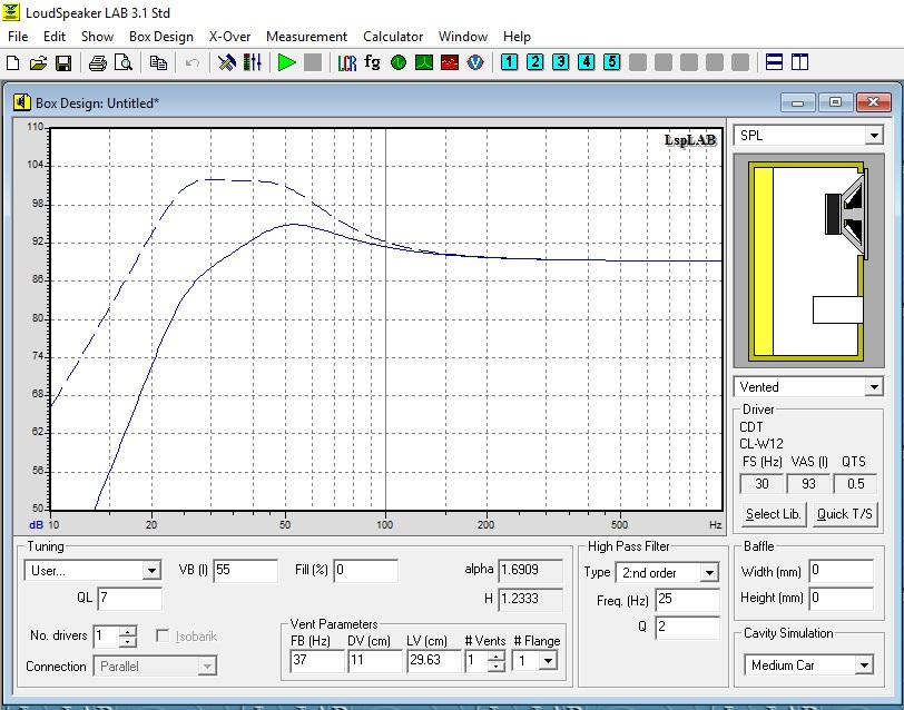 Фот два варианта в двух корпусах имеющихся в продаже: (закрытый ящик Box 12-3 и ящик с фазоинвертором щелевого типа Box MTX 12) - пунктиром отмечена АЧХ в машине среднего размера. Т.е. смотреть надо именно на неё.