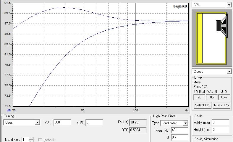 Срез снизу на 40Гц - заметьте ! И АЧХ имеет очень пристойный музыкальный вид ))) А главное с саба можно реально получить при 500 Вт усилка - всё на что он способен ! (при 30Гц такой фокус уже не прокатит ... )
