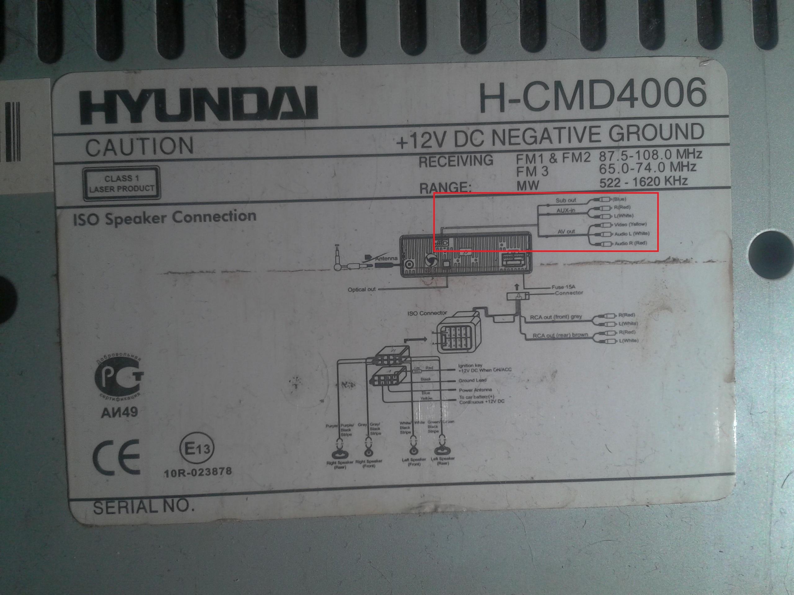 помогите пожалуста очень надо ! купил себе б/у Hyundai H-CMD4006 но проблема нет провода aux и видео входа к ним которые идут отдельно под не прикрученной крышкой ! и когда играет радио работают все калонки а когда usb или dvd не играет передний правый динамик ! что делать ! жалко выкидывать ! напишите мне ! max8888max@e1.ru или icq 411994523 хоть круглосуточно ! зарание спасибо !